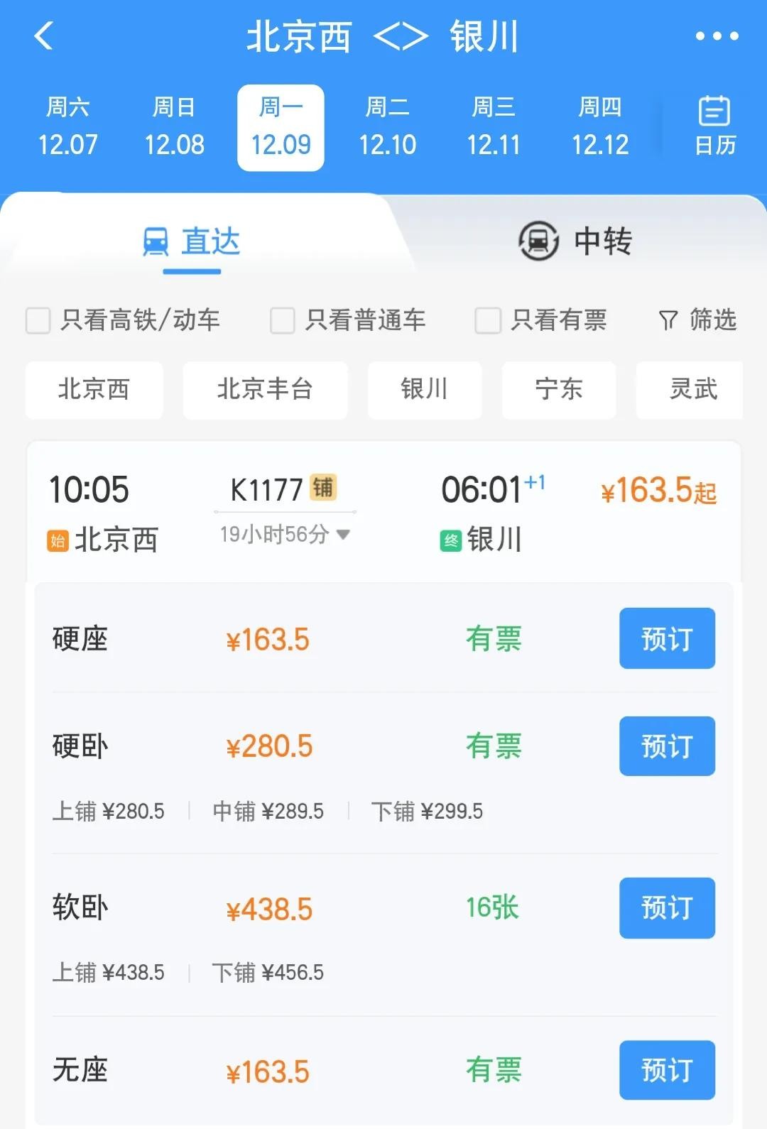 K1177次列车10点05分从北京西站发车,第二天早上6点01分到银川站,用时19小时56分钟。