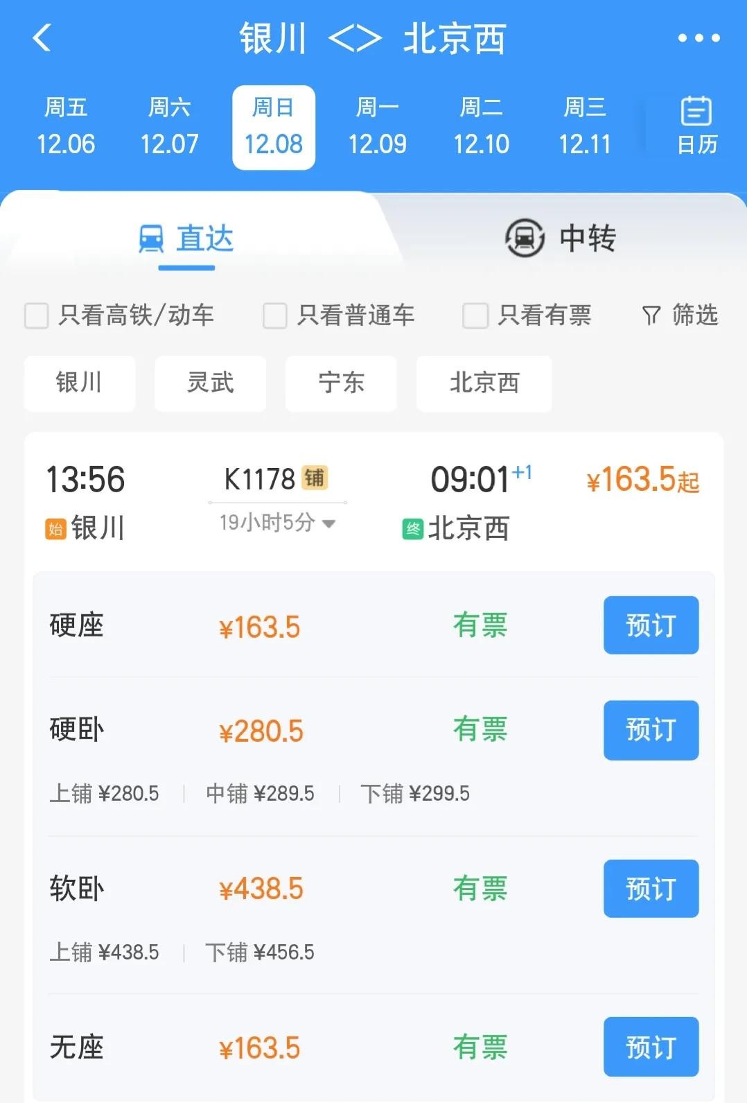 12月8日恢复银川到北京西K1178次,9日恢复北京西到银川K1177次