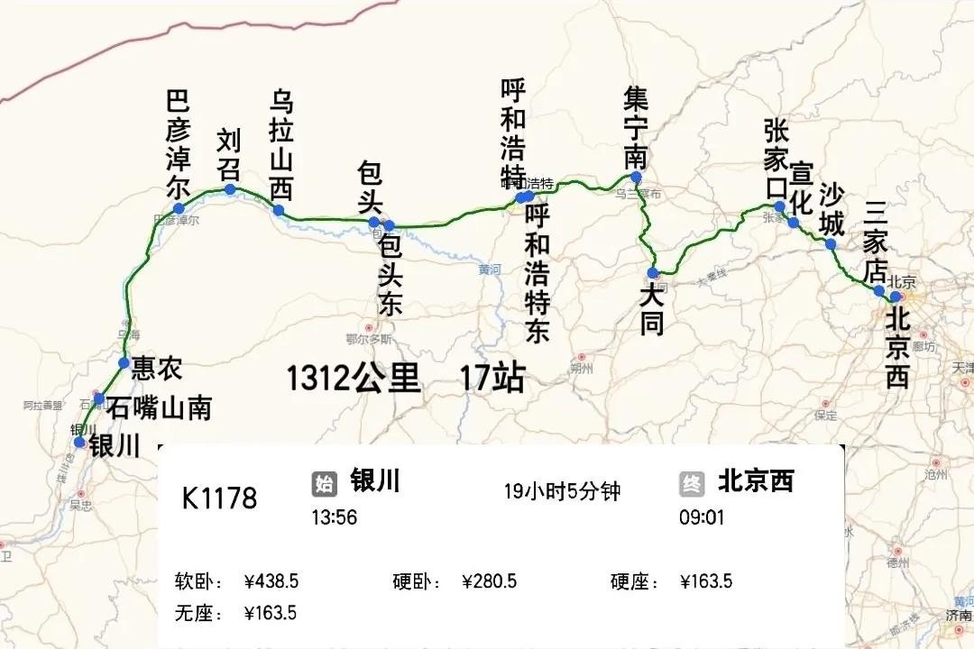 2024年12月8日起恢复开行银川到北京西K1178次列车,经兰包铁路、京包铁路、丰沙铁路、京九铁路运行,途径宁夏自治区、内蒙古自治区、山西省、河北省、北京市,1312公里,中途停靠15站,是银川到北京唯一一趟绿皮火车。