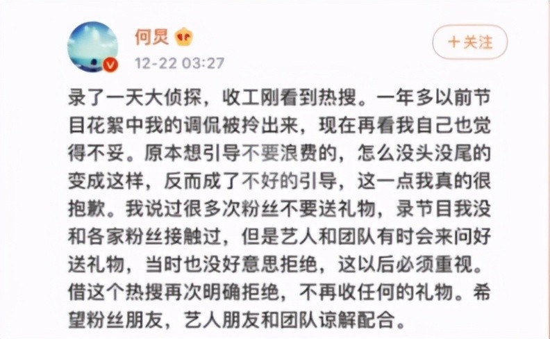 之后何炅也立刻发微博承认,艺人和团队有时会来问好送礼物,当时也没好意思拒绝,并称造成了不好的引导,今后不再收任何礼物。