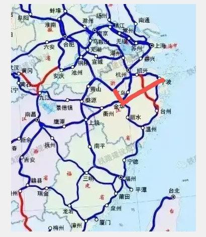 金华市目前可以通过杭长高铁和金温铁路二条线路向东南方向到达温州,向西南方向经过上饶到达南昌等城市,也可以向东北方向到达省会杭州和上海等城市,等到所有高铁线路建设完成后将可以直达宁波和安徽方向的高铁,届时金华将拥有五个方向的高铁线路,从下图可以看出金华市的大致高铁方向,注意想看详细的路线要看国家发布的,下图仅仅表示大致方向,不代表实际为位置。(红色是在建的高铁线路,蓝色的是已通的高铁线路)