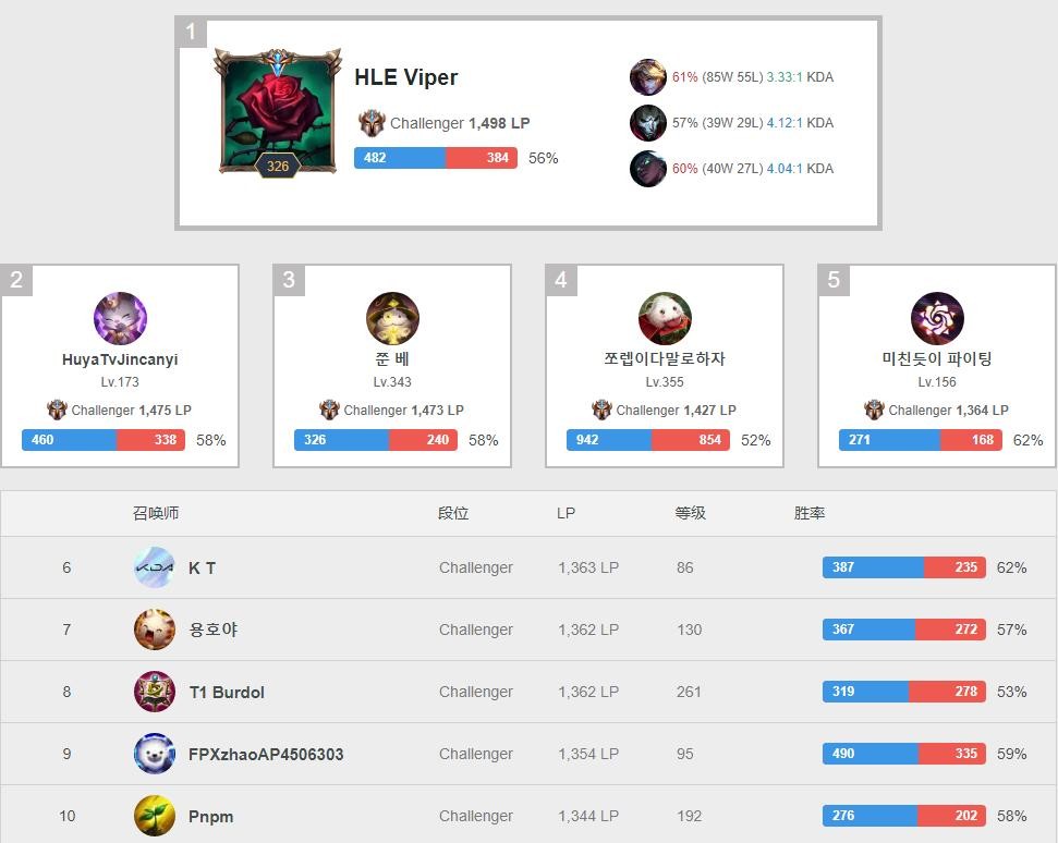 来看下目前的韩服前十情况吧,HLE战队的AD选手Viper目前登顶排名第一,排名第二的是知名主播金灿毅