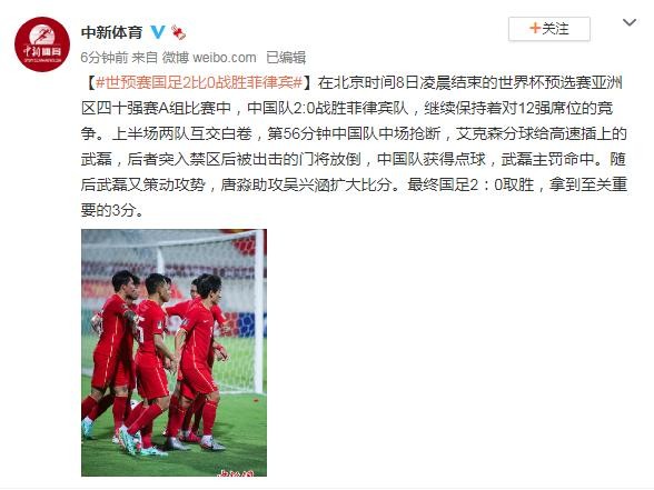 在北京时间8日凌晨结束的世界杯预选赛亚洲区四十强赛A组比赛中,中国队2:0战胜菲律宾队,继续保持着对12强席位的竞争。上半场两队互交白卷,第56分钟中国队中场抢断,艾克森分球给高速插上的武磊,后者突入禁区后被出击的门将放倒,中国队获得点球,武磊主罚命中。随后武磊又策动攻势,唐淼助攻吴兴涵扩大比分。最终国足2:0取胜,拿到至关重要的3分。
