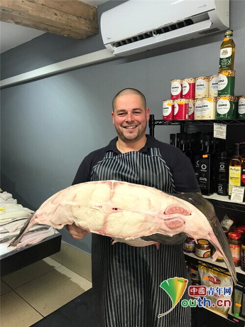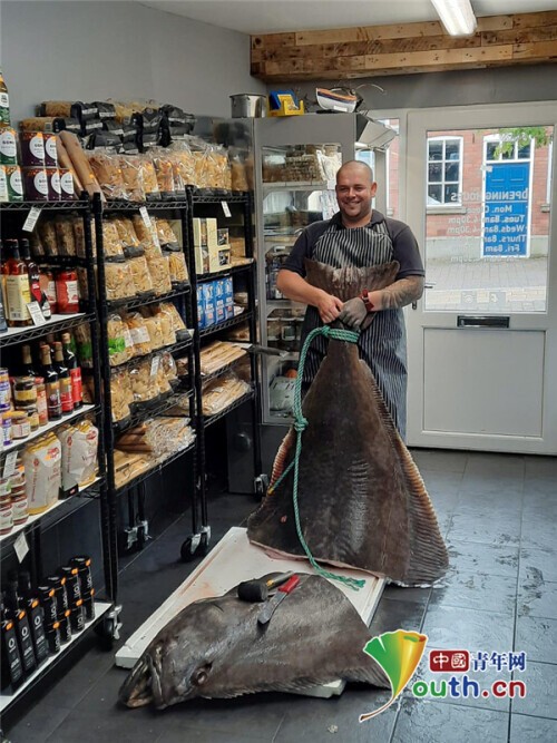 2020年8月26日讯,18日在英国斯托克波特Marple,当地一家海鲜餐馆的老板Jamie Barrett和一条超过21英石(约134千克)、长超过9英尺(约2.74米)的巨型比目鱼合影。34岁的Jamie表示,这是他在这一行22年以来,第一次看到如此之大的比目鱼。