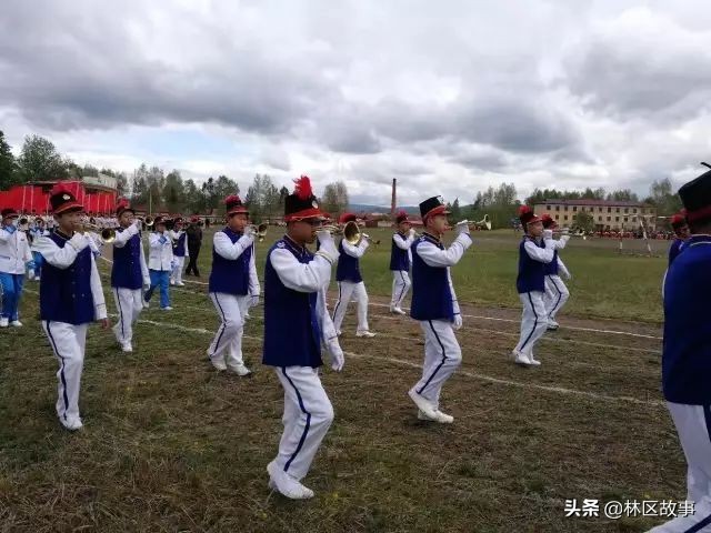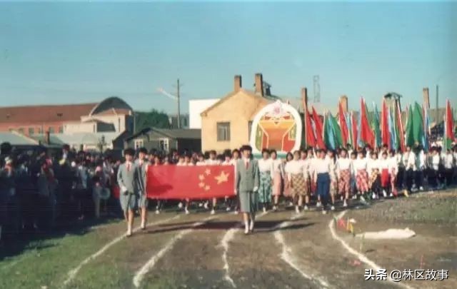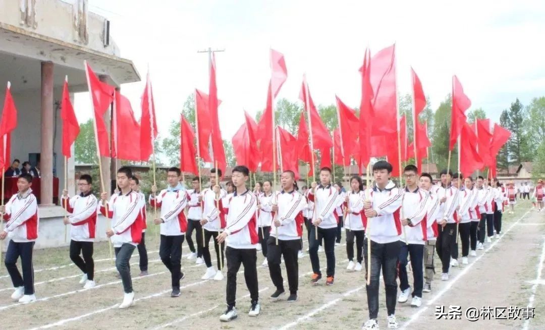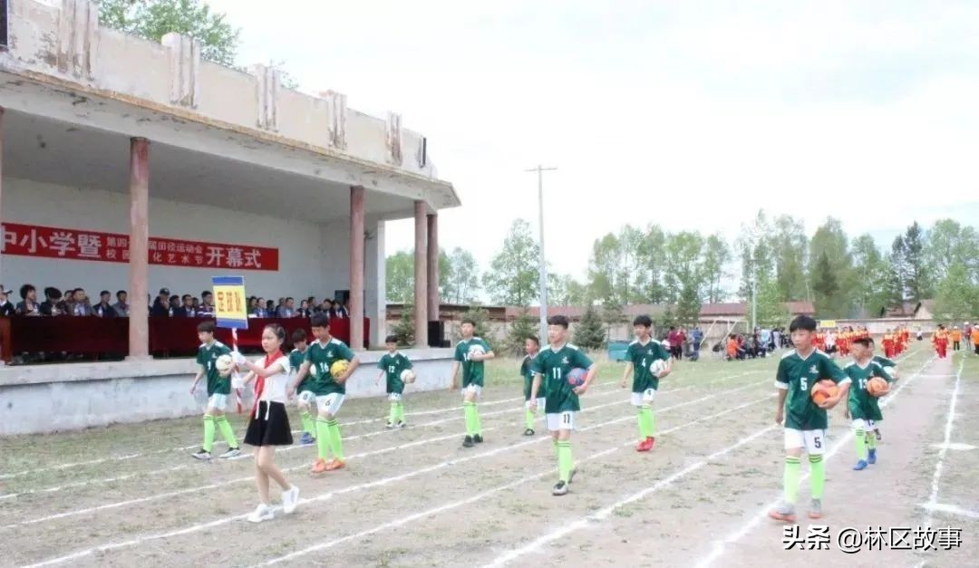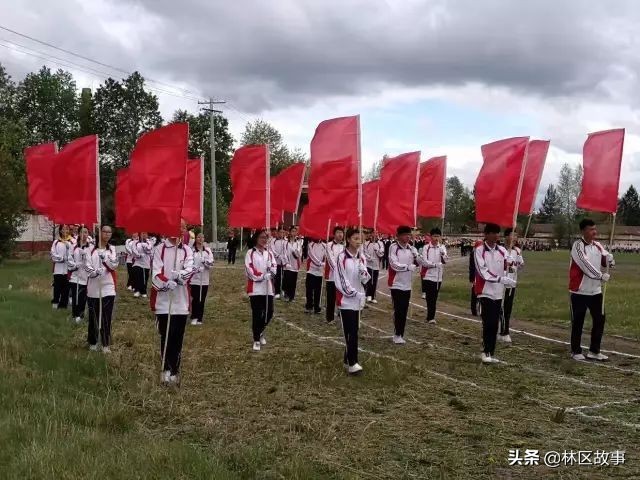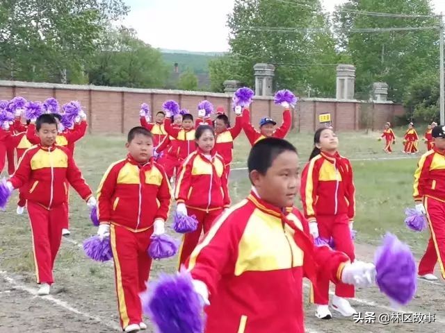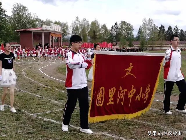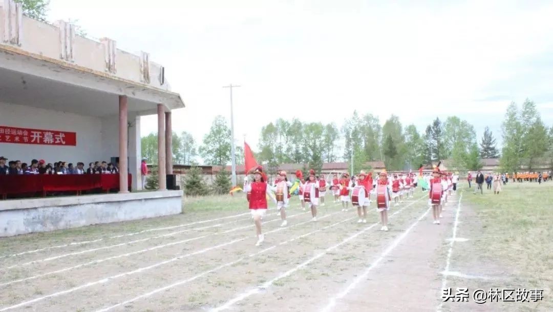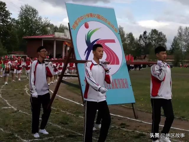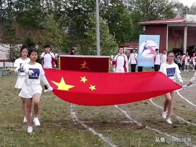 图里河中小学第45届田径运动会隆重召开。各年组运动员身穿统一服装,在嘹亮的运动员进行曲中,由四名国旗护卫手引领步入运动场。