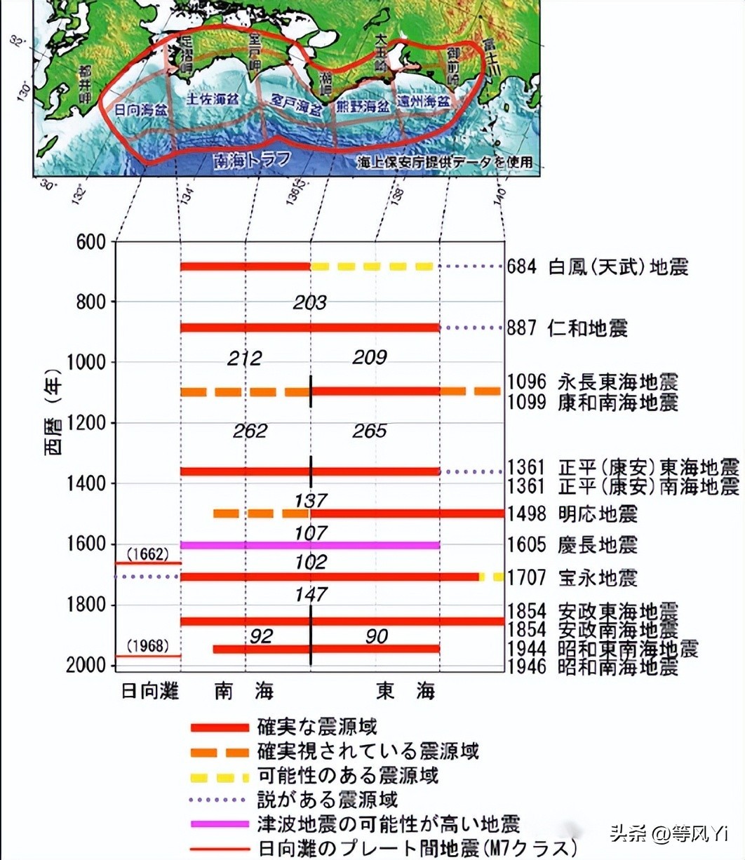 这个海沟边缘的断层面接触地方,就是大地震的面状震源区域,而这个区域的正上方就是南海海槽。自有地震记录以来,南海海槽区域就发生过多次巨大地震,近700年间发生过6次相关的大地震序列,有时候是南海海槽大部分一次性破裂,有时候是东海和南海区域在短时间内相继破裂(永长康和地震、正平地震、安政地震和昭和地震都是这种类型)。其震级在Mw8.0~Mw8.7不等,一般来说分段破裂震级较小,单次地震在Mw8.0~Mw8.4左右,而整体一起破裂的震级会在Mw8.5以上。据此认为南海海槽大地震的发震周期在100-150年左右,当然最近一次周期缩短到了90年,因此学者把周期范围扩展到80-150年左右。上次南海海槽发生大地震是1944和1946的昭和东海、南海地震,属于分段破裂,一次约8.4级,一次约8.1级,所以根据周期,未来50年内南海海槽再次发生大地震可能性很高,而更是有预测认为2030-2040年间南海海槽发生巨大地震可能性高达70%。
