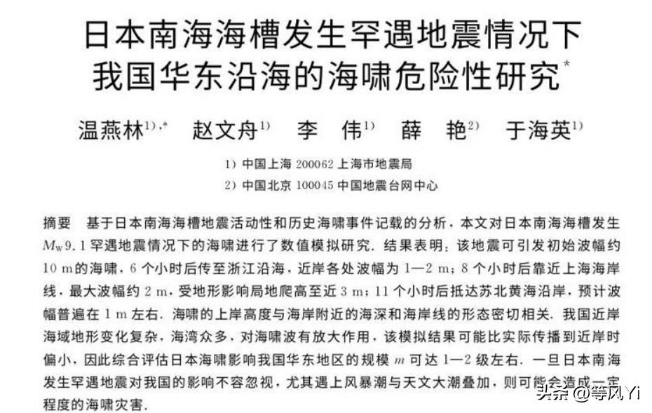 根据华东地区县志等文献记载,1707日本南海宝永地震和1854日本安政南海地震均对我国华东沿海造成海啸影响:江苏如皋海啸,淹毙多人;上海黄埔水沸,有高二三尺者。临海海潮泛滥,城乡沟池积潦,沿海庐舍多被淹没。而这两次地震震级分别为Mw8.7和Mw8.4左右。