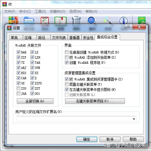 有的时候我们会发现明明已经安装了WinRAR软件,但是右键菜单没有相关压缩与解压的菜单,这是没有正确在右键菜单关联的缘故,这时你只需要打开WinRAR,然后单击菜单“选项”-“设置”-“集成综合设置”,将“在右键关联菜单中显示图标”勾上,单击“确定”即可解决问题了。