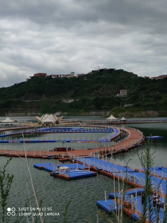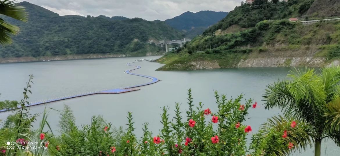 远远望去,这水上浮桥宛如东方的一条巨大的长龙,龙祥凤舞,真的是美极了,踏入浮桥上,好象座在我家里的摇摇椅上,沉睡在这安逸之中,让人陶醉,入迷。水上设施还算齐备,有游艇,摩托艇,可惜的是没有几个人来这里旅游,可能是因为疫情吧,没有开放,显得没有热闹的气氛。