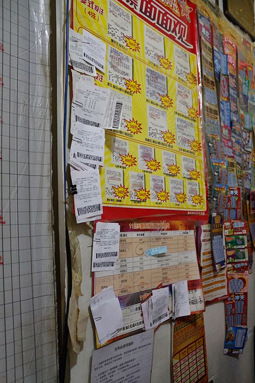 在店内的一张大乐透宣传海报上,夹着一叠一叠11选5彩票,每一叠的最上面都写着购彩者的姓名。贾淑珍说,这些票大多是多期投注票。