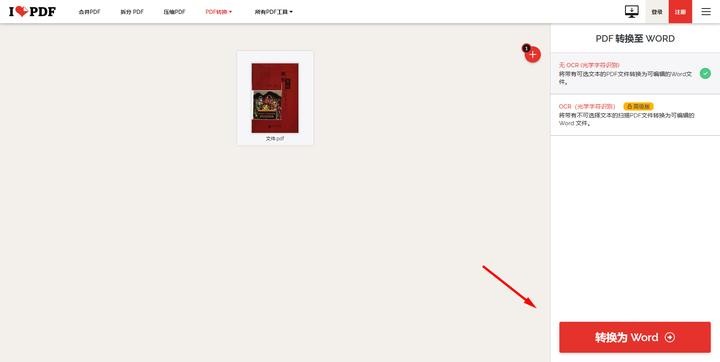根据自身需要,选择合适的转换级别,通常猫猫会推荐选择“无OCR”,这样不用单独花钱,设置好后点击下方的“转换为Word”,等待系统识别转换即可。