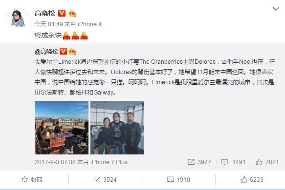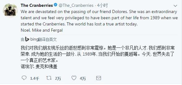 高晓松也在微博发文:“刚刚惊闻小红莓主唱Dolores在伦敦去世!想不到去年Limerick一别,终成永诀!怀念她凭虚御风的歌声,遗世独立的风范。《晓说》曾长期用她的Zombie做片头曲。向她致敬。”