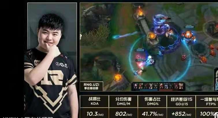 那么这份战绩图中都有哪些信息呢?首先,图中一共列出了UZI在那个季后赛所有比赛的综合数据,分别由战损比,分均伤害,伤害占比,经济差和一塔参与率所组成。UZI的这五项数据,居然全部都位列于所有参赛选手中的第一,堪称5数据封神,可见UZI在当时的统治力有多强。就拿伤害占比来说,普通的AD一般能上30%已经很不错了,而UZI居然高达41.7%,真的是把其他AD甩得远远的,连影子都看不到。