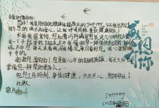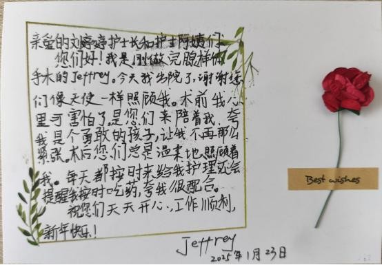 如今,Jeffrey已经康复出院,他怀着感激之情,用真挚的文字向医护团队表达了自己的谢意。在信中,他亲切地称雷盛钦主任为心中的“超级英雄”,并感谢护士长和护士阿姨们如同天使一般守护在他的身边。