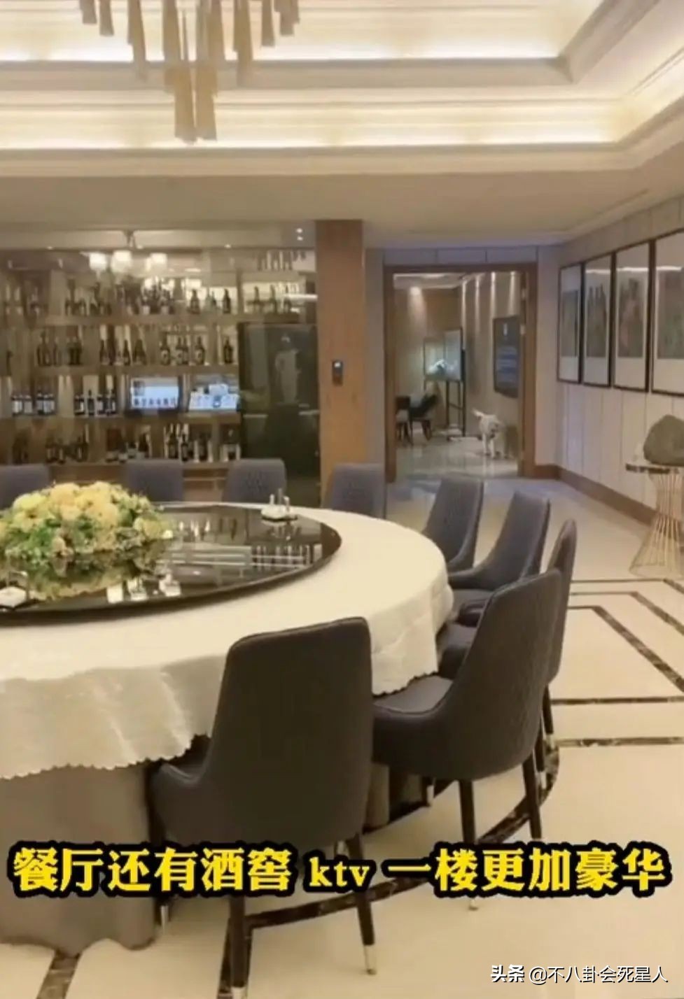 一楼大厅是餐厅,里面摆放着豪华的转动式餐桌,还有一整面墙都是酒柜,里面摆满了各种美酒。