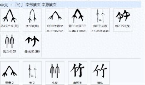 《说文解字》:“竹,冬生草也。象形。下垂箁箬也。”。犹其叶如屮下垂个个纷披者是竹字之范式。