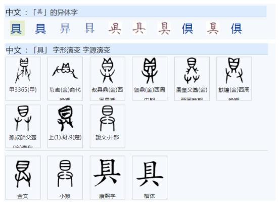 《说文解字》:“具,共置也。从廾,从貝省。古以贝为货。”。