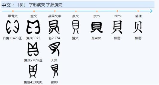 《说文解字》:“貝,海介虫也。居陆名猋,在水名蜬。象形。”。犹作为货币之海介虫壳者是貝字之范式。