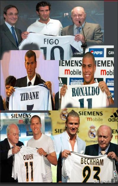 2000年夏天以5610万美元的创纪录身价挖来巴塞罗那中场核心菲戈2001年,两届世界足球先生的齐达内以6600万美元天价加盟皇马2002夏天,罗纳尔多带着世界杯金靴的荣誉以4400万美元身价加盟伯纳乌2003年,贝克汉姆3500万转会皇家马德里2004年1200万欧元引入欧文
