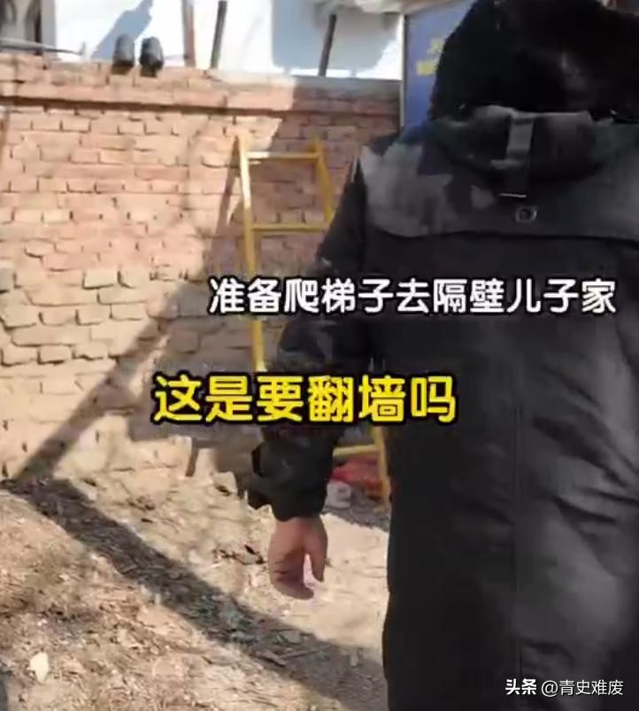 从现场的视频中可以看到,大衣哥身手利索的翻到了隔壁儿子家,看来翻墙这个动作,大衣哥已经非常熟练了。