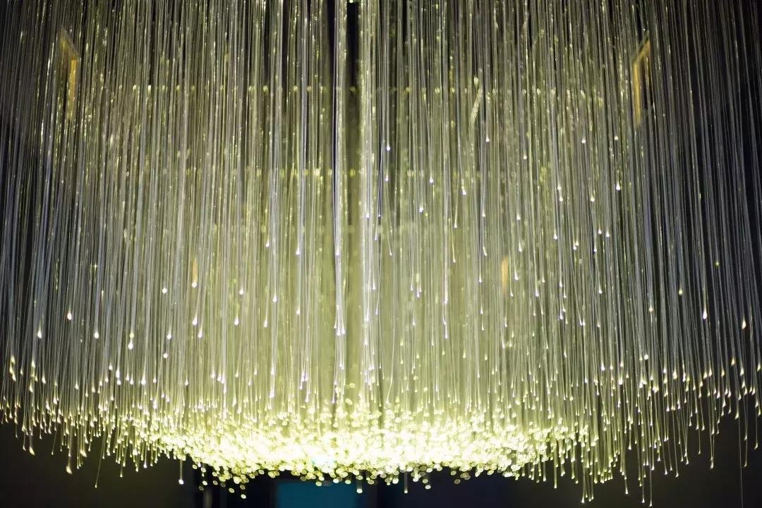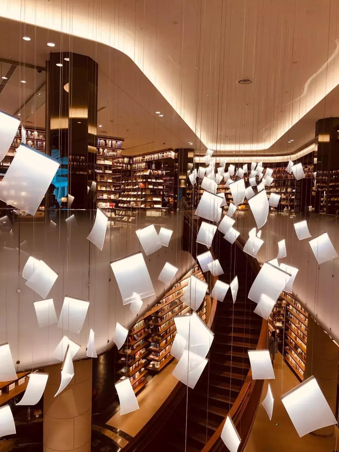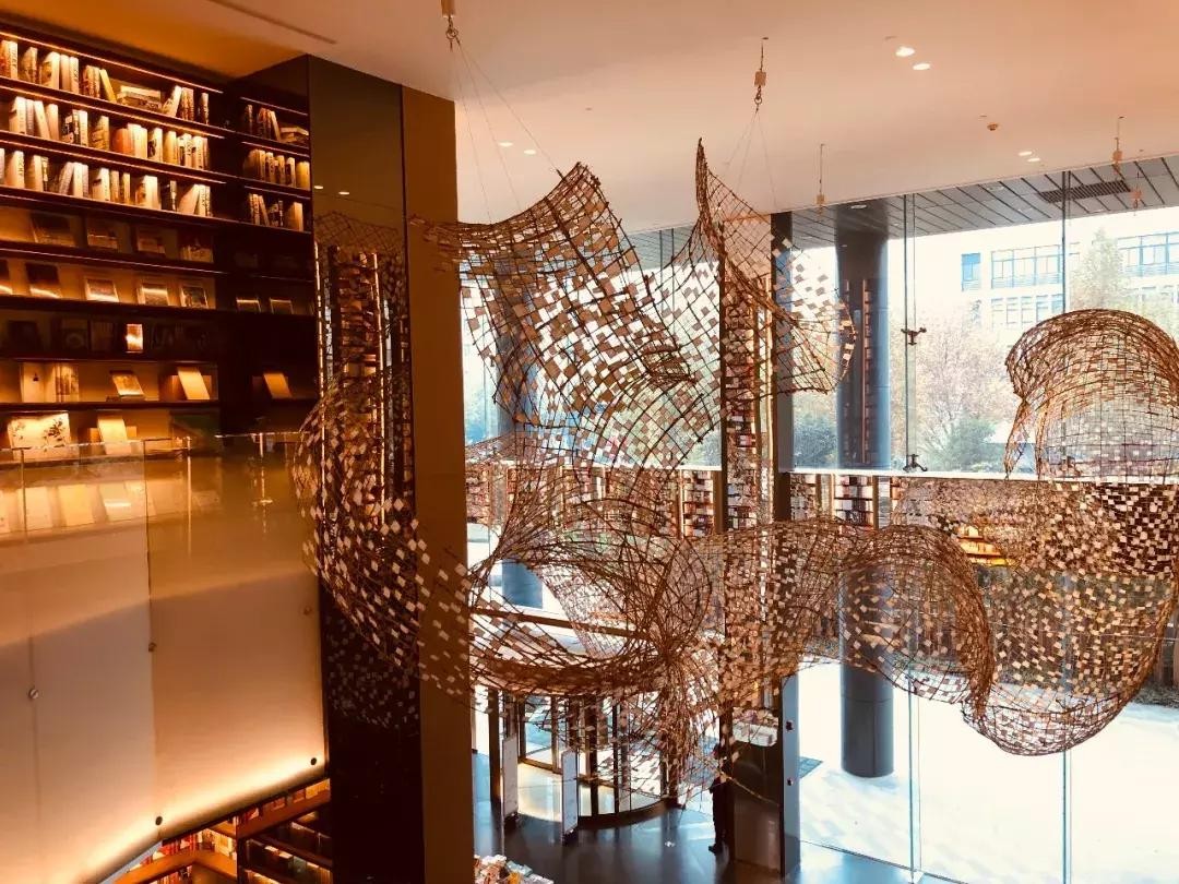 中庭由纸和竹子编制而成的抽象人形装置,还有几十片巨大“书页”组成的吊灯群,超级夺人眼球。