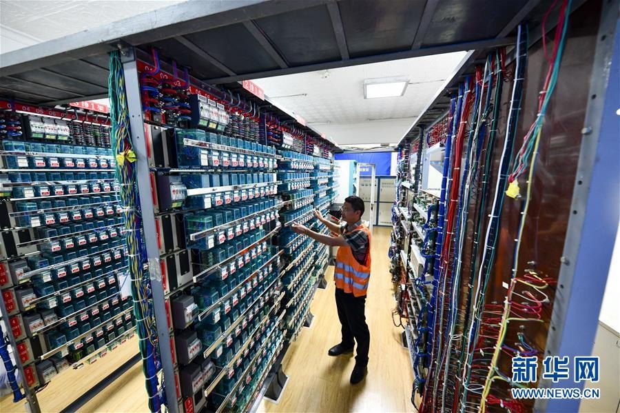 在成渝铁路柏林站电气设备室内,重庆电务段的车间主任赖克禄在老式设备架前对铁路的电气设施进行检查和调试(6月12日摄)。新华社记者 刘潺 摄