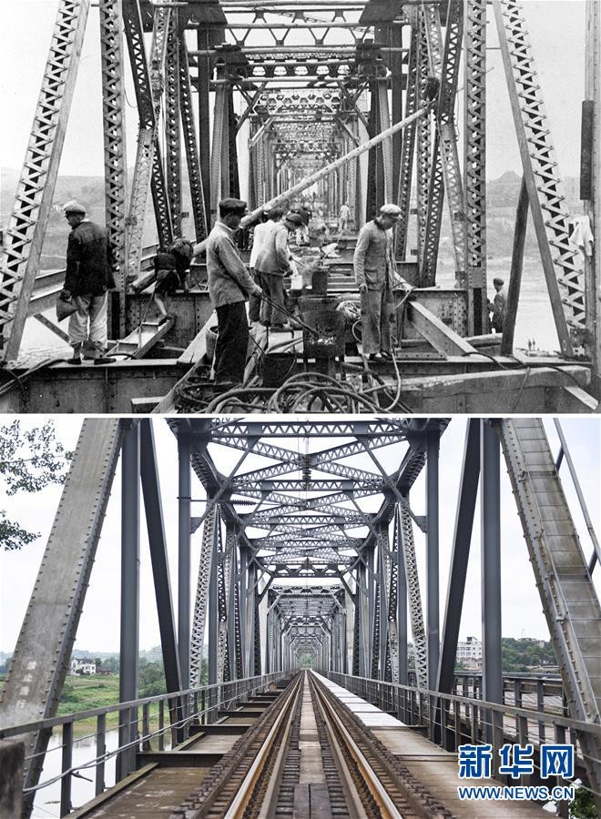 拼版照片:上图为修建成渝铁路的工人们在架设沱江大桥(资料照片);下图为6月12日拍摄的至今仍在使用的成渝铁路沱江大桥(新华社记者薛玉斌摄)。新华社发