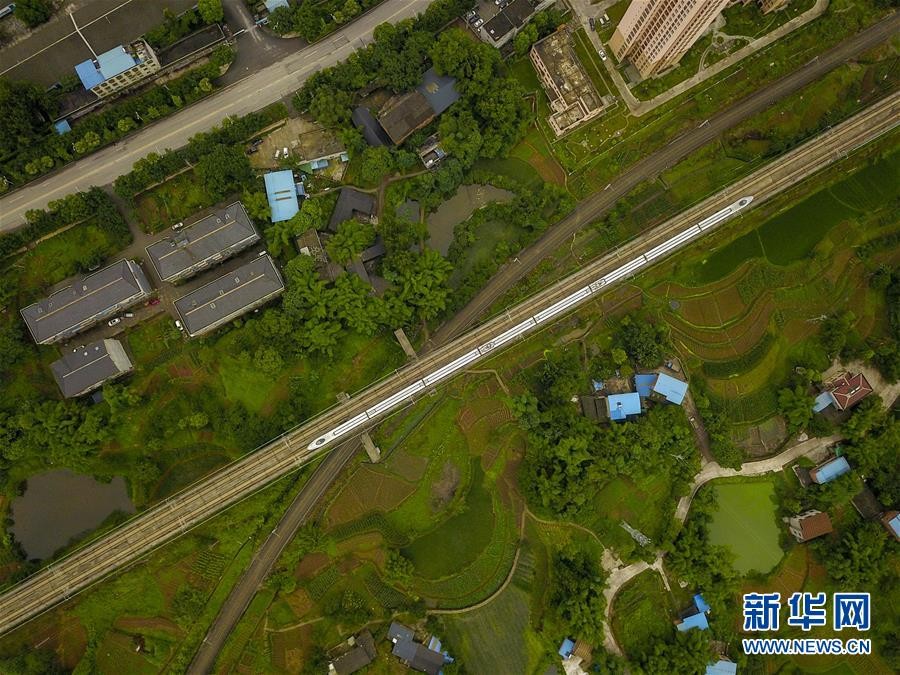 一列高铁列车在成渝高速铁路上快速通行(6月12日无人机拍摄)。新华社记者 刘潺 摄