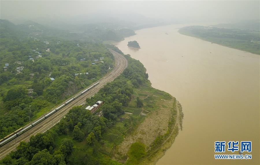 沿长江江岸而建的成渝铁路(6月11日无人机拍摄)。新华社记者 刘潺 摄