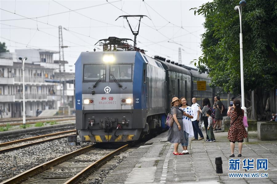 在成渝铁路铜罐驿站,客运列车进站时,几名来感受慢火车的游客在站台上拍照留念(6月11日摄)。新华社记者 刘潺 摄