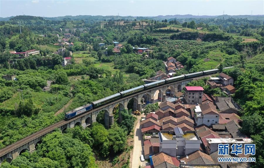 成渝铁路王二溪大桥采用了中国传统的石拱桥建造技术,成为国内少有的铁路石拱桥(6月13日无人机拍摄)。新华社记者 薛玉斌 摄