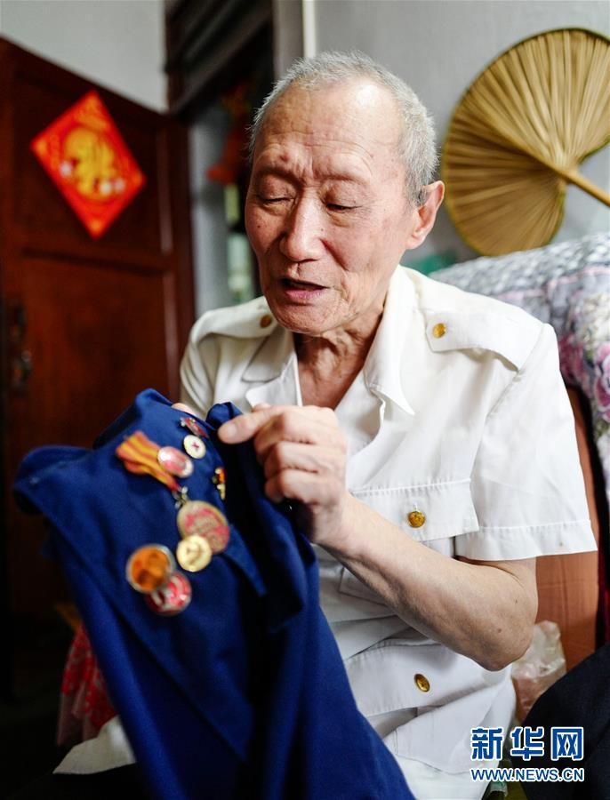 成渝铁路的建设者曾德华老人展示成渝铁路通车纪念徽章,介绍当年修路的情况(6月13日摄)。 新华社记者 薛玉斌 摄