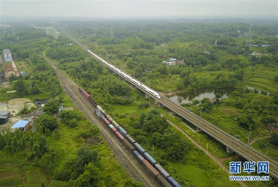在成渝铁路峰高铺站,成渝铁路(左)和成渝高速铁路双线并行在一起(6月12日无人机拍摄)。新华社记者 刘潺 摄