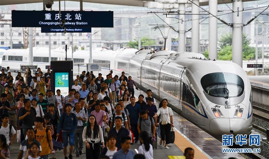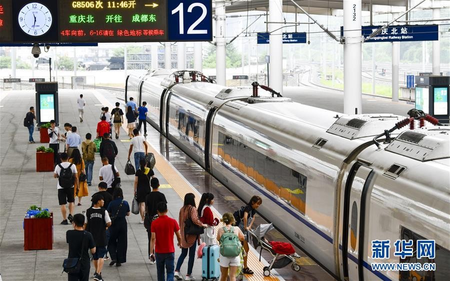 在重庆北站站台上,旅客们有序登上重庆开往成都的高铁列车(6月11日摄)。新华社记者 刘潺 摄