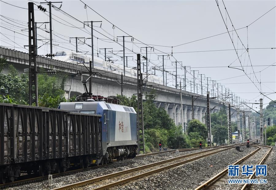 在成渝铁路峰高铺站,一列货运列车停在成渝铁路线上,上方一列高铁列车通过成渝高速铁路(6月12日摄)。新华社记者 刘潺 摄