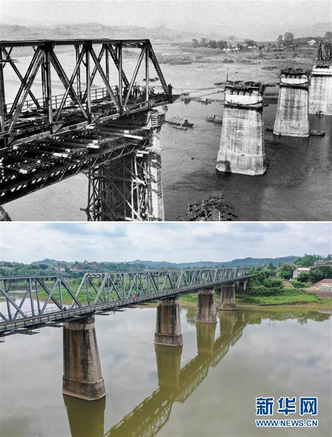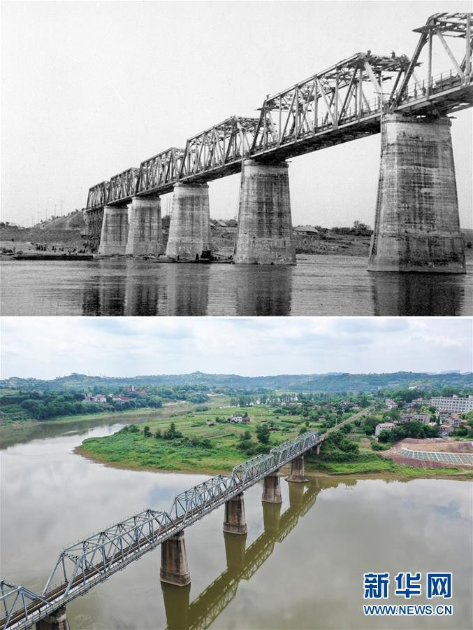 拼版照片:上图为1951年11月底完工的成渝铁路沱江大桥(资料照片);下图为6月12日无人机拍摄的至今仍在使用的成渝铁路沱江大桥(新华社记者薛玉斌摄)。新华社发