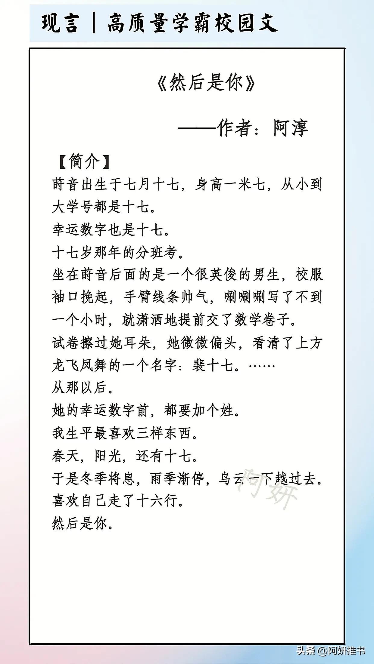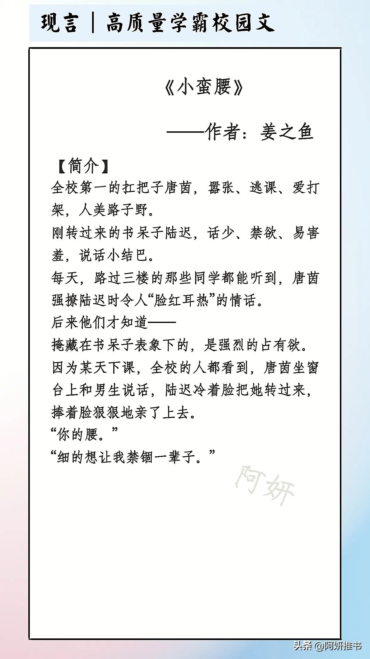 今天给大家推荐的是:3本高质量学霸校园小甜文!校园文里校霸男主还是学霸男主,都让人难以抵抗,没遇到你之前,冷漠,痞帅清冷禁欲系,乖戾不羁,可遇见女主后,妥妥的宠妻小达人,我有千般不驯,只为你妥协。校园小甜文,满满的青春恋爱氛围,一脸姨母笑。