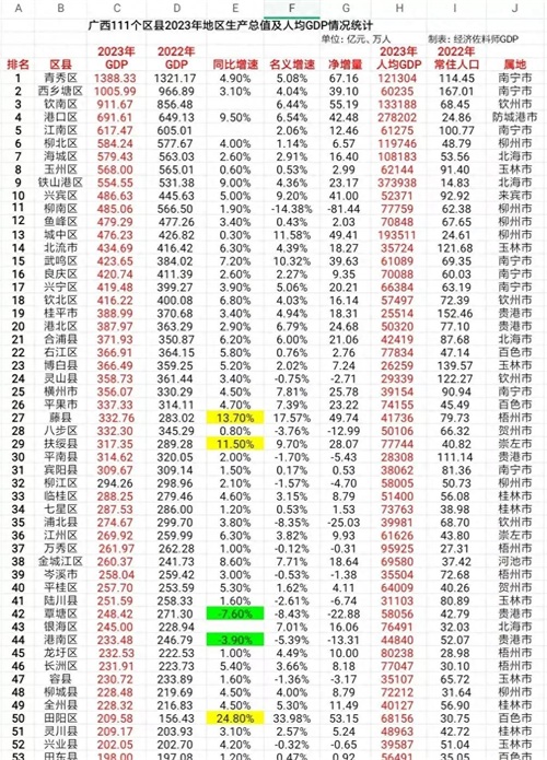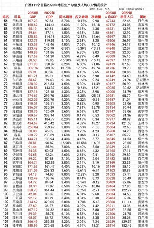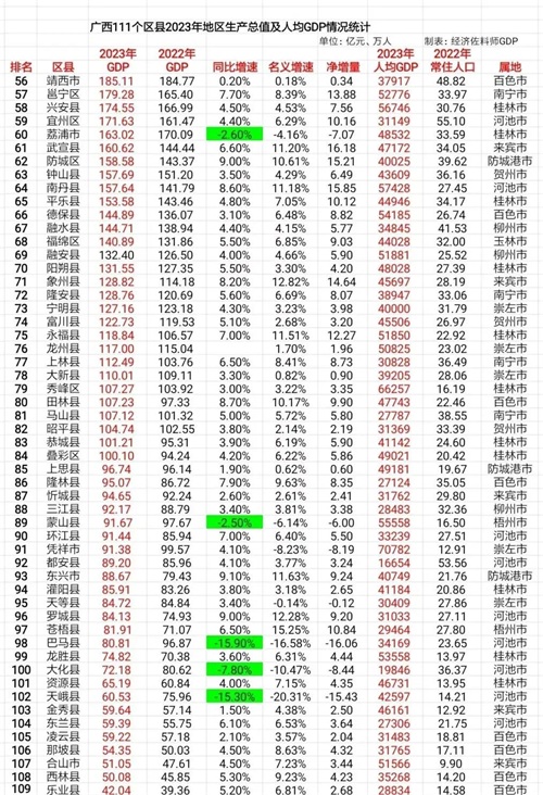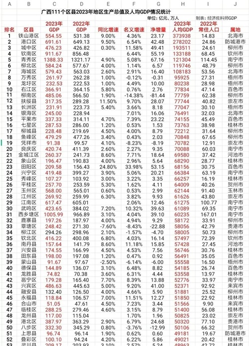 在广西壮族自治区的111个区县中,除了极个别尚未公布2023年GDP的情况外,我们可以通过其他已经公布的数值来计算这些区县的GDP。例如,钦南区、银海区和龙州县。目前,只有柳江区和融安县的GDP可能会发生微小调整,但这不会影响它们在全区的排名。