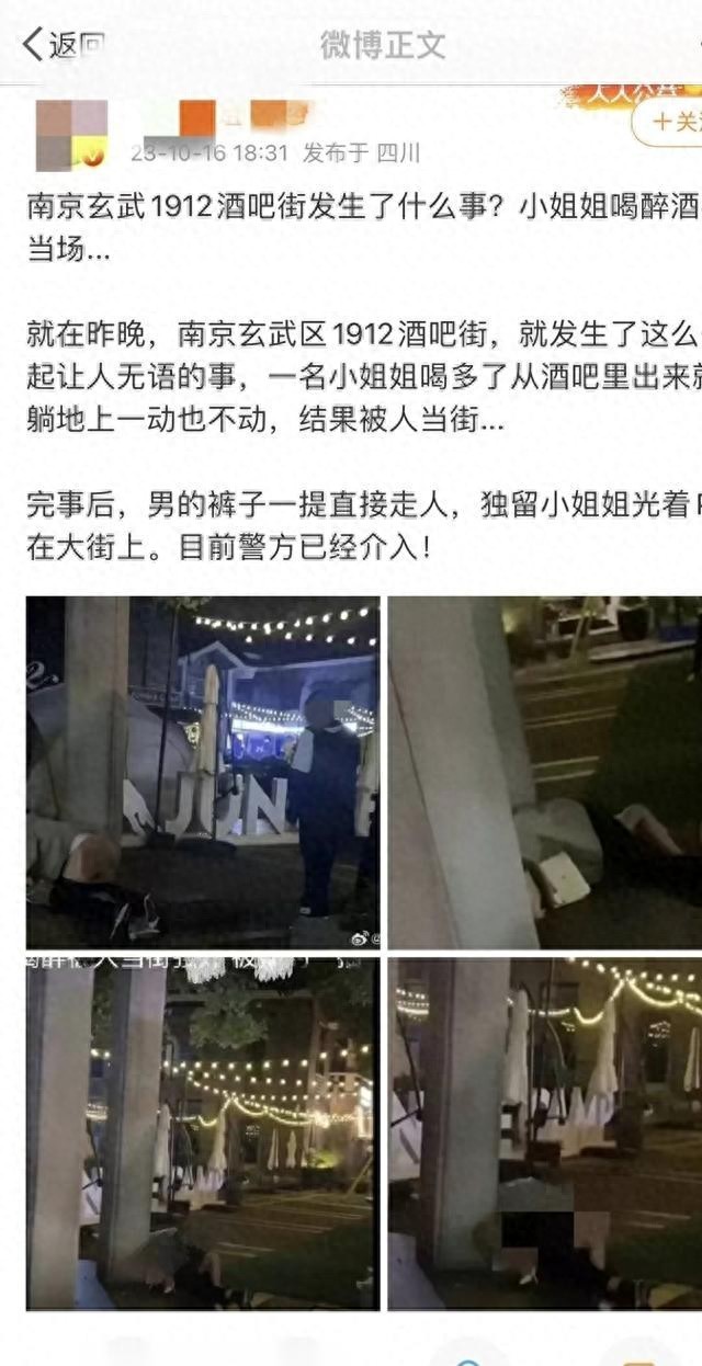 10月17日晚,一条网传信息在网络上引发了广泛关注。据称,在南京玄武区1912酒吧一条街,一名醉酒女子遭到性侵,而多名路人围观并拍摄视频,但没有人出面制止。然而,根据10月18日上午华商报大风新闻记者从当地警方获得的消息,经核实并非强奸,实际情况与网传信息存在差异,但警方并未透露更多细节。