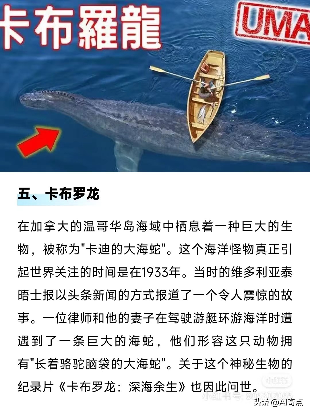 故事追溯到1933年的一个晴朗夏日,一群渔夫在捕鱼过程中遭遇了一场意外的邂逅。他们看到一个巨大的生物在距离船不远处悠然游弋,它长长的颈部如同灵活的鞭子在空气中挥舞,紧接着迅速沉入水中,消失得无影无踪。这次遭遇激发了公众对卡布罗龙的极大兴趣,相关报道在报纸上广泛传播,使得卡布罗龙逐渐成为一个富有争议的未解之谜。