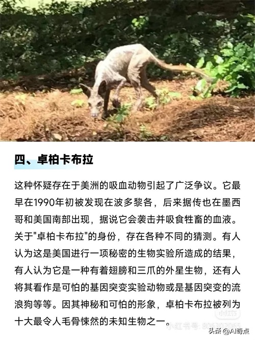 在南美洲多雨丛林的深处,流传着一种令人毛骨悚然的生物传说,它就是被称为“天卓柏卡布拉”(Chupacabra)的神秘怪物。这个名字源于西班牙语,意为“吸食山羊血的怪兽”,因其常被描述为袭击农场动物并吸干其血液的可怕存在。