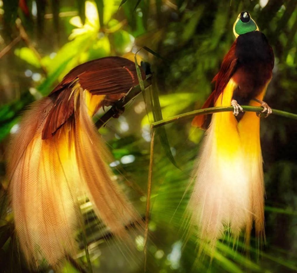 大极乐鸟拥有华丽柔顺的羽毛,羽毛从两翼之下垂下来,像一位高贵的公主。它们还是王者级别的浪漫舞者 。求偶时会不约而同地抖动羽毛,跳舞或唱歌,竭尽全力展示自己的舞姿和羽毛 吸引雌性 。与雄性相比,雌性的颜色是单调的褐色,没有华丽的外表 。体型也相对较小。大家知道为什么吗?