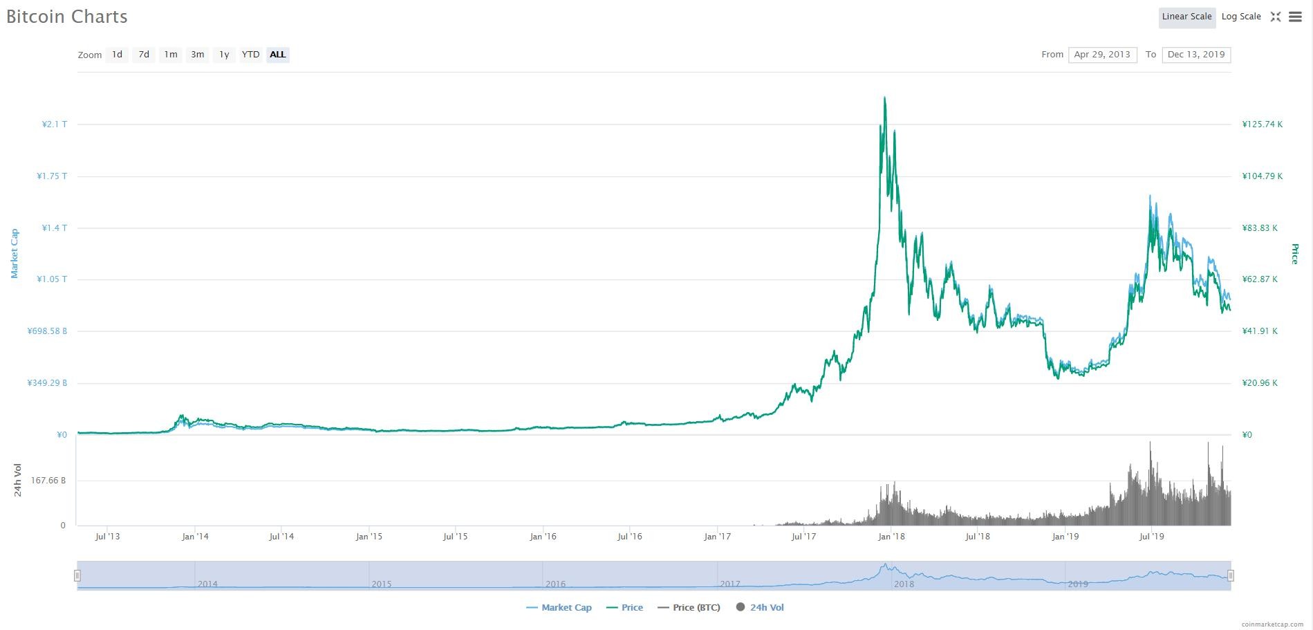 下图中的绿色线条即 CoinMarketCap 上比特币从 2013 年至今的价格走势。