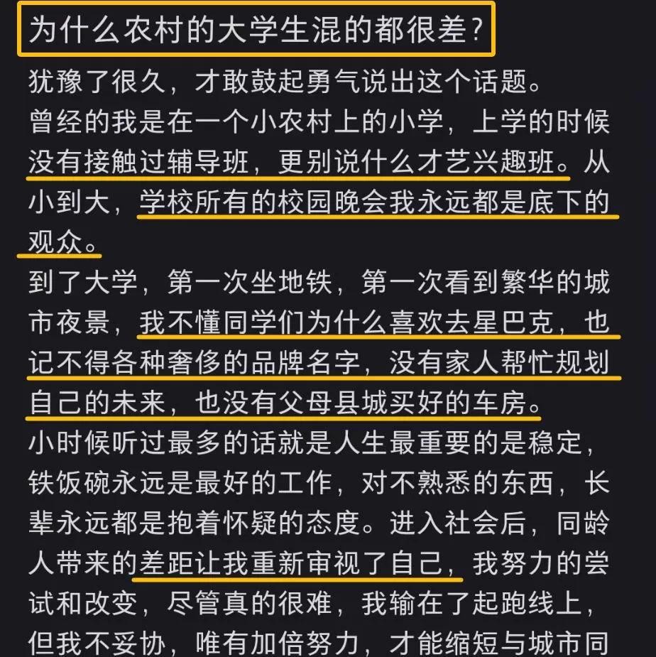 翻看网络热搜,经常能看到一些关于“农村大学生”的帖子讨论。有人感叹他们的成绩优秀却难找到理想工作,也有人说他们步入城市后,面对种种挑战感到迷茫失落。这些声音不禁让人深陷思考:他们走出农村,却迷失在城市。 三环以内,还有差距吗?它们的逆袭梦,又该如何开始?