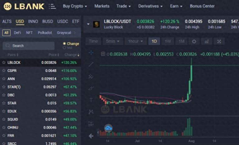 LBLOCK 从 0.001 美元然后从 7 月 28 日至 31 日暴涨至撰写本文时的每日高点 0.004395 美元,四天内上涨了 440%,过去 24 小时上涨了 120%。Lucky Block 也是LBank本身最大的加密货币赢家,如上图所示。