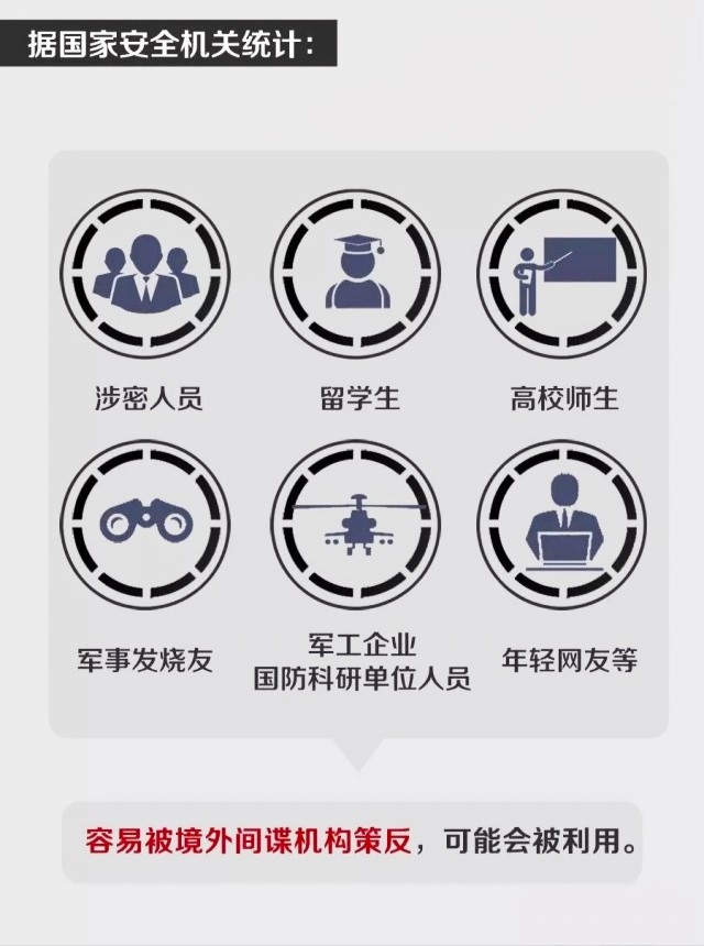 另外,敌特势力还会针对:政府官员、学院学者、军工单位、科研院校机构、保密单位、企事业单位、我国境外人员、掌握重要资料数据的人做渗透行为。
