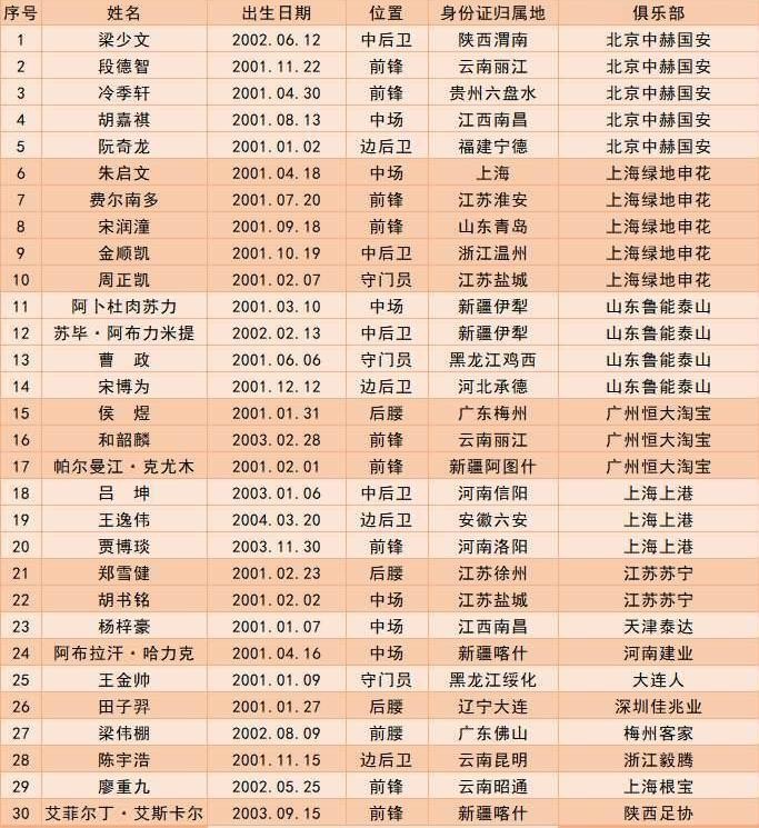 扬子晚报网10月21日讯(记者 孙云岳 张晨瑆 张昊 )新赛季的中乙联赛将在10月24日正式开赛,U19国青队将在海埂赛区参加中乙的小组赛。今日,国青队公布了出征的30人大名单出炉,成耀东挂帅,首场比赛将对阵湖南湘寿。