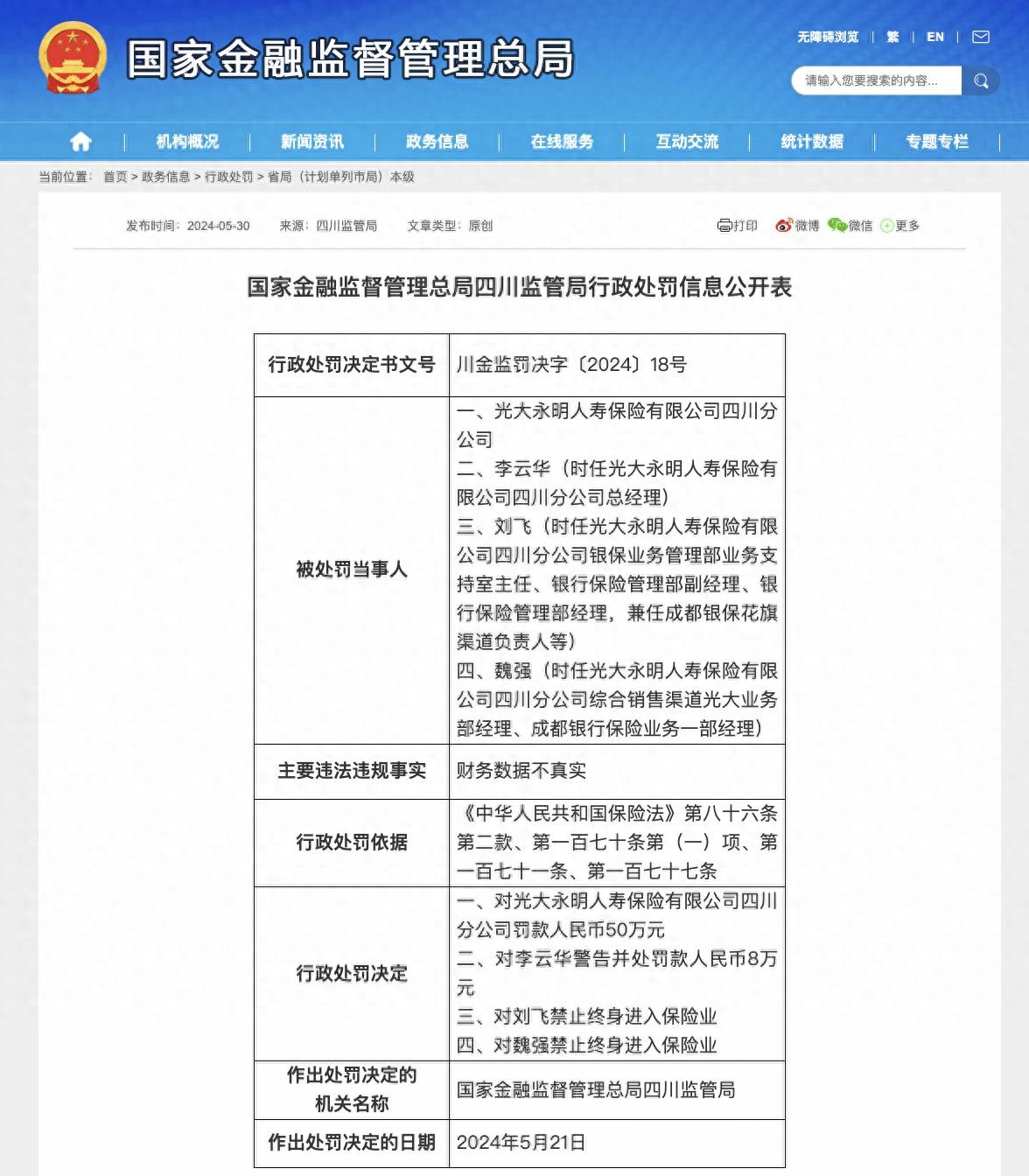 财务数据不真实,光大永明人寿及分公司总经理获罚百万、两名责任人终身禁业