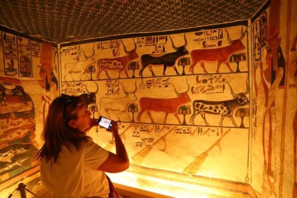 ↑1月24日,一名游客在埃及卢克索王后谷参观奈菲尔塔利地下陵墓。