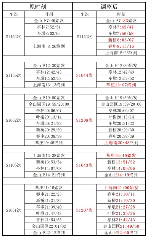 铁路部门根据上海南站功能定位变化和莘庄站启用所带来的出行需求,统筹做好高铁、普速和市域列车开行安排,在“1·5”新列车运行图中对上海地区列车开行方案进行调整。新图中,金山铁路开行列车38对,较调图前增加0.5对。